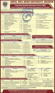 Abdul Wali Khan University Mardan Admissions Open August 25, 2019 by adminAbdul Wali Khan University Mardan Admissions Open Abdul Wali Khan University Mardan Admissions at Main Campus, Timargara Campus, NTS Entry Test Schedule