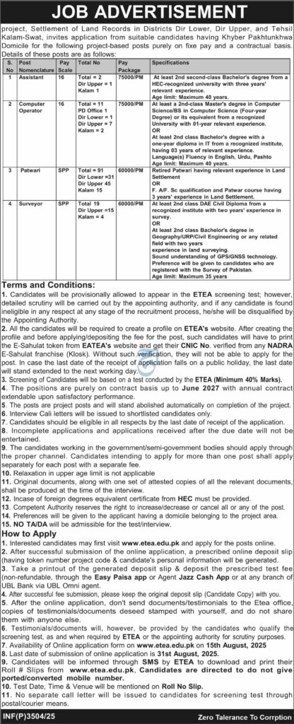 Download ETEA Assistant, Computer Operator, Patwari and Surveyor Jobs Advertisement.