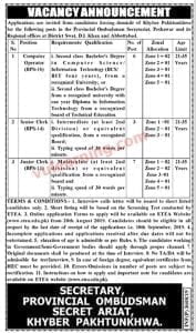 ETEA Provincial Ombudsman Secretariat Computer Operator Senior Clerk Junior Clerk Jobs 2019 August 20, 2019 by adminETEA Provincial Ombudsman Secretariat Computer Operator Senior Clerk Junior Clerk Jobs 2019 ETEA Senior Clerk, Junior Clerk, Computer Operator MCQs Test Syllabus, Test Criteria, Paper Pattern, Sample Papers