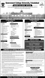 GC University Faisalabad Admission Open Notice BS Programs September 1, 2019 by adminGC University Faisalabad Admission Open Notice BS Programs Online Application for BS Programs Admissions Open Government College University Faisalabad Morning Evening