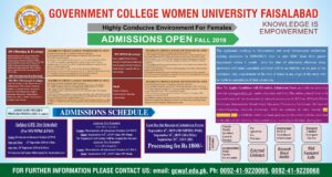 GC Women University Faisalabad Admissions Open 2019 February 9, 2021September 8, 2019 by adminGC Women University Faisalabad Admissions Admissions Forms Merit Lists Roll No Slips Past Papers Syllabus fee Structure Sample Papers Entry Test Pattern Online Exams BS MS M.A M.Sc BBA Admission Started Open in GC Women University Faisalabad