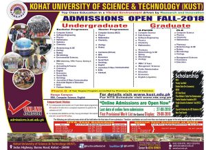 Kohat University of Science Technology KUST Admission 2018 Test Through NTS June 15, 2018 by adminKohat University of Science Technology KUST Admission 2018 Test Through NTS Kohat University of Science & Technology (KUST) (Admission Fall 2018)