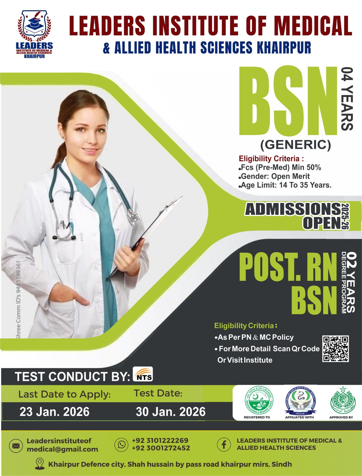 Leaders Institute of Medical Allied Health Sciences Khairpur BS Nursing Admission Syllabus MCQs Past Papers pdf