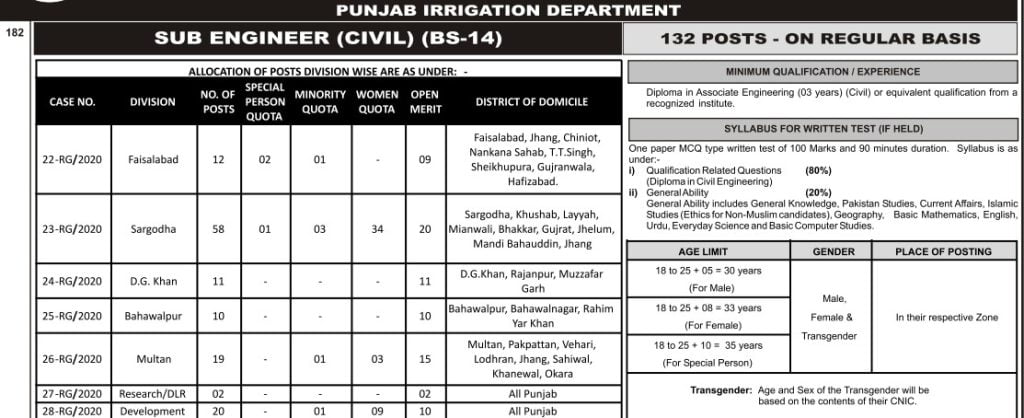 Punjab Irrigation Department Sub Engineer Civil Jobs Test Pattern Paper Distribution Past Papers