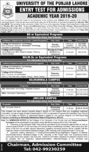 University of the Punjab Lahore Entry Test for Admissions 2019 BS Computer Science B.Architecture BFA MSc Computer Science MA Fine Arts Main Campus Gujranwala Campus Jhelum Campus