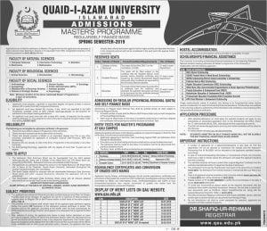 Quaid-e-Azam University Admissions 2019 December 30, 2018 by adminQuaid-e-Azam University Admissions 2019 Master Programs Admissions Entry Test Schedule QAU University