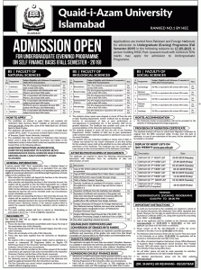 Quaid-i-Azam University Islamabad Admission Open September 8, 2019 by adminQuaid-i-Azam University Islamabad Admission Open BS Physics Chemistry Geophysics Electronics Math Statistics Botany Zoology Biotechnology Biochemistry Environmental Sciences Micrbiology Admissions Open in Quaid-i-Azam University Islamabad